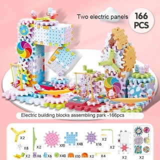 Material: High-quality, durable plastic Design and Style: Colorful, motorized gear building set Particle: 166pcs, 180pcs, with 2 electric motherboards. 249pcs and 163pcs with 3 electric motherboards. (without battery)
